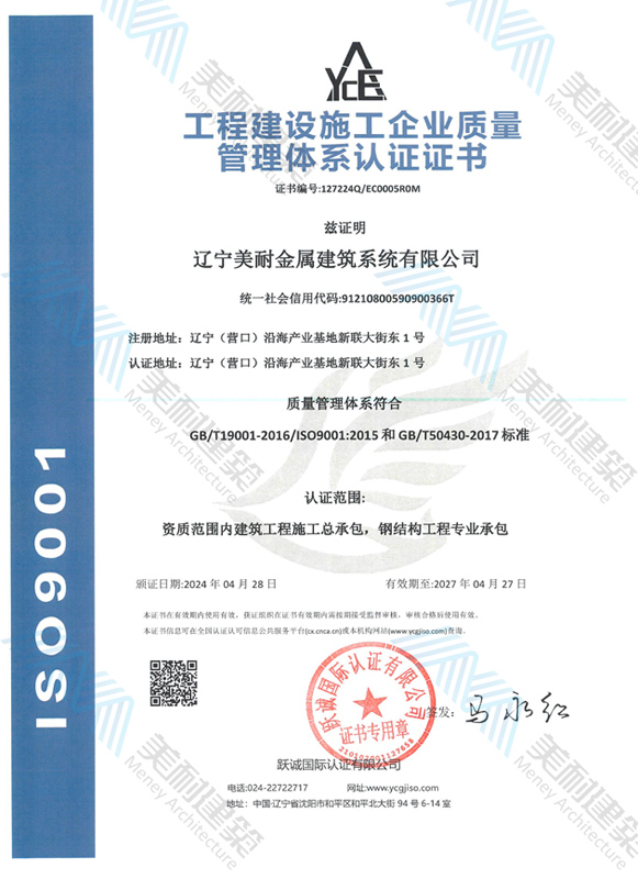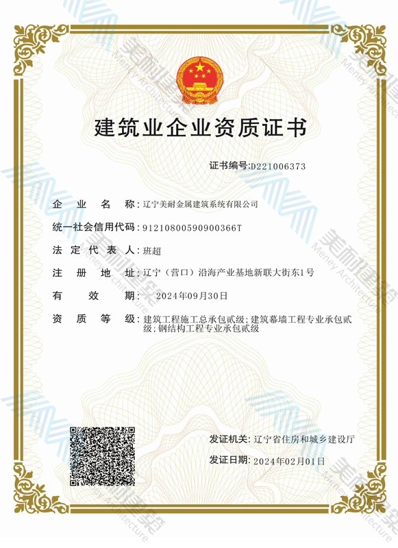 遼寧美耐金屬建筑系統(tǒng)有限公司位于遼寧(營口)沿海產業(yè)基地,專注于預制金屬建筑系統(tǒng)領域,是一家集工業(yè)建筑設計、制作、施工及相關的技術咨詢與服務為一體的綜合性服務企業(yè)。作為國家鋼結構協(xié)會會員、中國建筑金屬結構協(xié)會會員單位與國家高新技術企業(yè),美耐建筑集建筑工程施工總承包、鋼結構工程專業(yè)承包等多種資質于一身,并擁有22項鋼結構建筑領域專利,9項軟件著作權。